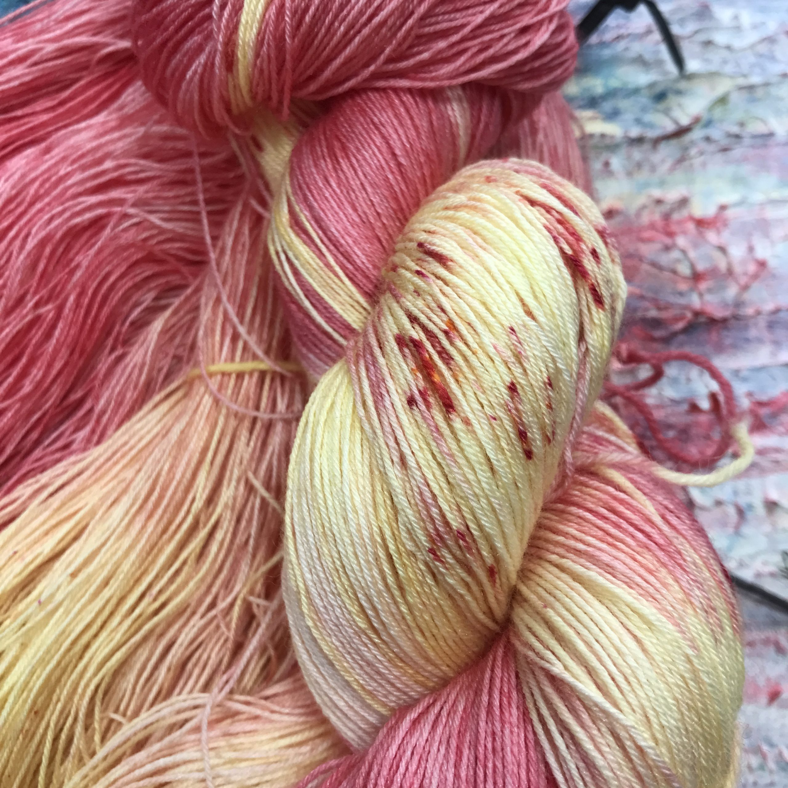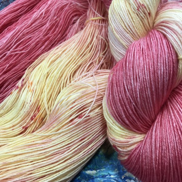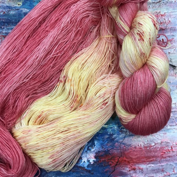 Diese gelb/roten sind aus 80% Wolle (Merino) /20% Seide, herrlich weich und die Seide verleiht dem Strickstück einen dezenten Schimmer.